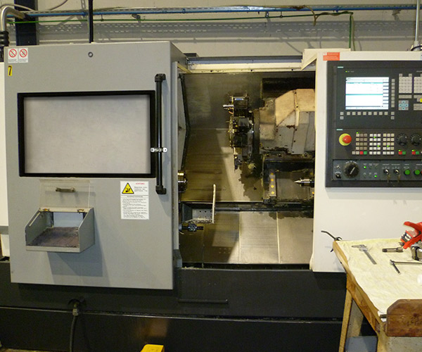 Durchmesser 380 mm max.Länge max. 600 mm12 fach Werkzeugwechsler davon 6 mit angetriebenen Werkzeugenmax. Spindeldurchlass : Ø 62mm Stangenlader Progammieroberfläche : Siemens Sinumerik 810 D